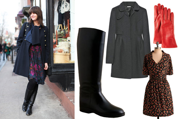 Above, from left: Aigle Ecuyer Boots, $189, available at J. Crew; Miu Miu Funnel-Neck Wool Coat, $1148, available at Net-A-Porter; Grandoe Red Leather Gloves, $60, available at Last Call; ModCloth Trollied Dolly Paint Me a Picture Dress, $74.99, available at ModCloth.