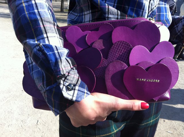 LOVE THESE HANDBAGS SHOWN HERE IN THE STREETS OF PARIS FASHION WEEK. MY FAVORITE OF COURSE THE MARC JACOBS HEART CLUTCH. WHICH ONE IS YOURS? OH, AND DID YOU GUYS NOTICE A PLUM TREND 😉