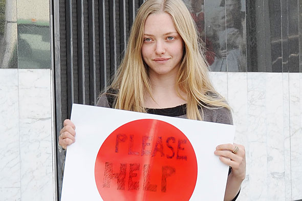 Amanda Seyfried holds up a 'Please Help' sign in support of the victims of the Japanese Earthquake and Tsunami while out with a friend in West Hollywood, CA. London Entertainment / Splash News.