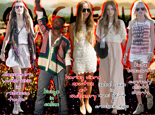 Celebs and it-girls busted out their festival wear for Coachella this weekend to great effect. And it wasn’t just festival-goers like Kate Bosworth in Current/Elliott or Alexa Chung in a beaded 3.1 Phillip Lim who stole the show style-wise. Performers Kanye West and Lauryn Hill rocked in spring 2011 runway looks–Kanye in a women’s blouse from Céline and Lauryn in a striped Jil Sander. Stripes emerged as a trend for the weekend, as well as delicate lace numbers, and the requisite tiny cutoff jean shorts and floaty maxi skirts.