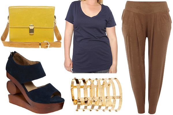 Gallery Hopping—Cool and casual, the lightweight suedette pants bring an element of sophistication to an otherwise low-key outfit. Bright and architectural accessories like this structured yellow bag and awesome wooden heel make it perfect for an afternoon of art-viewing.
