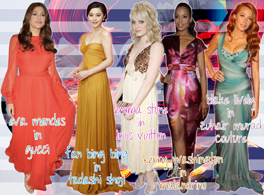 Celebs turned it out at parties this week and on the red carpet so I thought I’d give them their due. Celebs like Eva Mendes, Fan Bing Bing, and Blake Lively wore bold colors–Lively matched her seafoam Zuhair Murad couture gown with bold red hair, too. Emma Stone looked delicate and sparkly in Louis Vuitton while Kerry Washington shimmered in Catherine Malandrino.