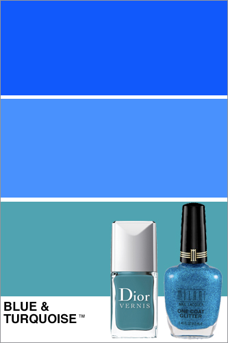 Dior Vernis in Nirvana, $21, available at Dior; Milani One Coat Glitter Nail Lacquer in Blue Flash, $4.99, available at Milani Cosmetics.YSL La Laque in Turquoise Blue, $20, available at YSL; Essie Nail Polish in Fair Game, $8, available at Essie.