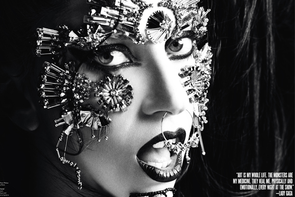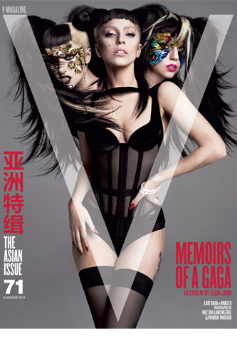If you haven’t heard, V is all about G—not only is Lady Gaga once again on the magazine’s V71 cover, her inaugural two page column rolls out in the same issue. The singer stars as a three-headed musical hydra for “The Asian Issue,” (available to download in Chinese!) in a shoot snapped by Inez van Lamsweerde and Vinoodh Matadin and styled by, who else, Nicola Formichetti. The accompanying spread has Gaga once again changing up her look, this time channeling sort of a Harajuku Girl Dominatrix who stumbled into a face-painting group in summer camp. Also included is an interview by Sir Elton John, in which the songstress says, “My dad’s a whiskey mouth like me, so we don’t argue much about my recreational life: boozing and recording.” When Elton asks her what the most spectacular thing she’s ever seen when looking into an audience, she answers with alacrity—”Myself. It’s like a magnificent disco ball, with twenty thousand tiny mirrors reflecting back at me….I see myself through my fans. I feel God through their love.” Apparently, she’s also really into Edith Piaf and…Gregorian chanting.