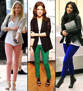 Wake up your spring wardrobe with this season’s hottest trend: bright colored jeans. Cameron Diaz worked a salmon pair of Rag & Bones ($165 rag-bone.com), Anna Kendrick made a bold statement in kelly green Rag & Bones ($165 rag-bone.com) and Kim Kardashian stepped out in royal blue J Brand 811’s ($176, 323-852-5000).