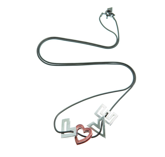 Maria designs statement jewellery and clothing, often with a gothic influence. Starting initially as a jewellery designer and working in collaboration with others, Maria now has her own jewellery and clothing line which is based around the concept of ‘Jewellery-Wear’ when jewellery becomes the primary focus of the outfit. For her first collection for TOPSHOP she has created a rose gold heart and gold plates letters spelling out ‘LOVE’ which can be worn either studded onto clothing or hanging from a chain. The set will come with a jersey vest to stud the letters onto. This creates jewellery that is truly personal and can be changed each day according to the wearer’s mood.