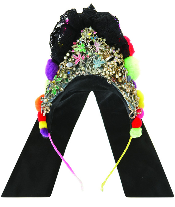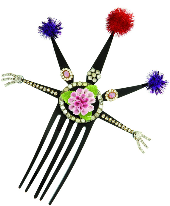 Nasir Mazhar is a London-based milliner and NEWGEN-recipient known for interpreting traditional headewear and drawing inspiration from his urban surroundings. Nasir will be reworking three of the ceramic bejewelled crown headpieces he made for the Meadham Kirchhoff SS11 mainline show in his first collaboration with TOPSHOP. He has also created three metal hair combs in geometric designs which are at once deco and modern, like wearable art.