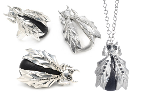 The only way I like bugs, as my jewelry! Accompanying the arrival of warmer weather is its uninvited guest, the pesky insect. This summer, I’m switching gears and welcoming the non-living version, Meredith Kahn’s bug-inspired jewelry designs for the Made Her Think collaboration with designer Mandy Coon. The collection consists of four beetle-like black gunmetal and Rhodium-based pieces (a ring, necklace, small and large brooches), some with leather snakeskin and Swarovski crystal detail in ruby, greige, emerald, and jet hermatite. While beetles are mostly harmless, the menacing horns and edgy details take a walk (or fly) on the darker side, characteristic with both MHT and Mandy Coon’s style. The collection was shown alongside Mandy Coon’s fall ’11 line at Lincoln Center during Fashion Week and will be shipping this summer. Better scoop up these buggy accessories in the pre-sale because style junkies are sure to be swarming. The pieces start at $223 and will be available on Bonadrag and Eva NY, and for pre-sale here.