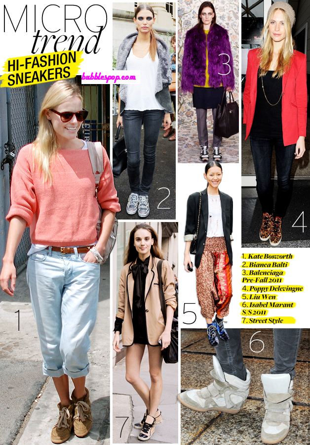 While I certainly enjoy the artsy aspect of hi-fashion sneakers, I’m also over the moon for the classic and sporty styles seen at Balenciaga and adored by the always-stylish Kate Bosworth! Speaking of the former, I was particularly pleased with the sneakers I saw in the Parisian fashion house’s Pre-Fall 11 collection. In the look featured above—described by designer Nicolas Ghesquiere as “wellness wear” or in other words, a French-chic take on gym clothes—a royal purple alpaca fur jacket was styled with a black tunic over gray tailored trousers and finished with athletic-inspired lace-up sneakers. Bosworth, on the other hand, constructed a more casual ensemble while out at lunch in Los Angeles last month, which included Topshop’s Coral Knitted Stitch Yoke Jumper ($65), MiH London’s Boy Cropped Slouchy Leg Jeans ($253) in Hickory Wash, and her favorite Isabel Marant Bobby Sneakers ($725, available in September). Of course Bosworth isn’t the only one fawning over Isabel Marant’s covetable kicks! Spotted on the streets of Milan a stylish civilian late last year sporting the Perkins Suede and Leather Wedge Sneakers ($660, 212.219.2284) from the S/S 11 collection, which have a very similar look. Both Isabel Marant styles have a hidden, built-in wedge, which offers the appearance of a sneaker, but also gives you a flattering, elongated leg like a heel—what more could you want? Finally, I totally approve of how another savvy civilian incorporated a pair of hi-fashion sneakers into her look and love the idea of pairing this casual footwear with a delicate dress and blazer for an unexpected yet chic daytime look.