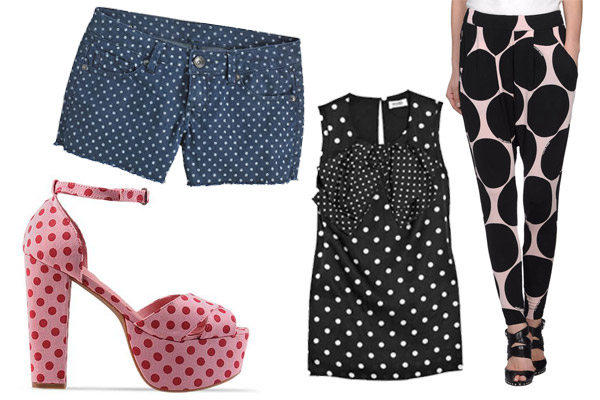 Jeffrey Campbell El Carmen, $119.95, available at Solestruck; Delia's Dot-Print Denim Short, $19.50, available at Delia's; Sonia Rykiel Polka Dot Top, $273, available at Net-a-Porter; Miss Sixty Pant, $90, available at Miss Sixty.
