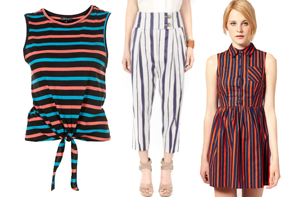 Topshop Multi Stripe Knot Front Tank, $28, available at Topshop; Vivienne Westwood Anglomania Striped Pants, $241, available at My Wardrobe; CTA ASOS Stripe Shirt Dress, $68.96, available at ASOS.