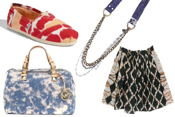 Toms Tie Dye Canvas Slip-On, $53.95, available at Nordstrom; Michael Kors Grayson Bag, $377.03, available at Repertoire; Tom Tom Jewelry Tie Dyed Necklace, $230, available at Need Supply; Wren Tie Dye Skirt, $249, available at Les Nouvelles.