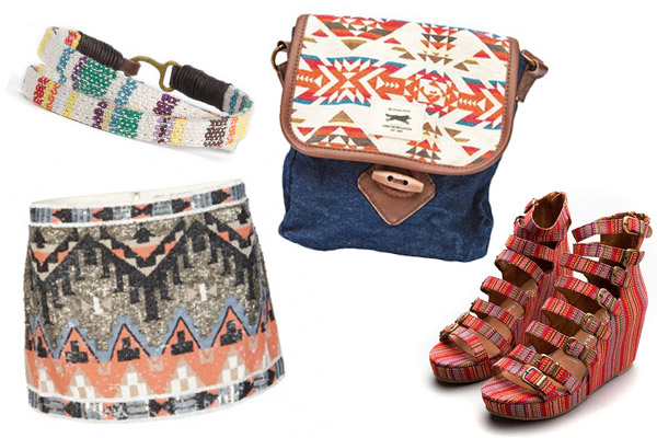 Aimee Lynn Wrap Bracelet, $8, available at Nordstrom; AllSaints Aztec Skirt, $299, available at AllSaints; Obey Tribal Bag, $36, available at Karmaloop; Jeffrey Campbell All-Caps Red Aztec Stripe, $126, available at Lori's.