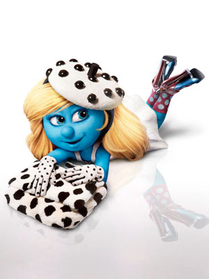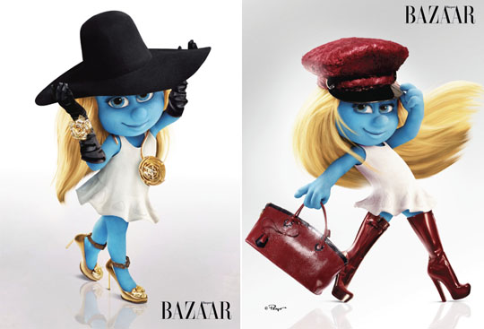 In honor of the new Smurfs movie, out July 29, Harper’s Bazaar shot the only lady Smurf, Smurfette, for a fashion spread in the mag’s August issue which hits newsstands July 12. The editorial highlights accessories (it’s hard to find designer close in Smurfette size) and in these pix, she’s wearing fall Louis Vuitton and Lanvin. Everything looks good with blue it turns out. 😉
