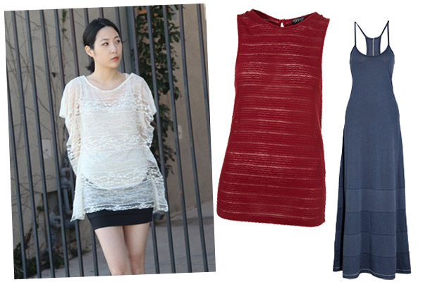 Above, from left: MikkatMarket Lace Ruffle Top, $35, available at Mikkat Market; Topshop High Neck Stripe Tank, $30, available at Topshop; Rag & Bone Stretch-cotton Maxi Dress, $195, available at Net-A-Porter.