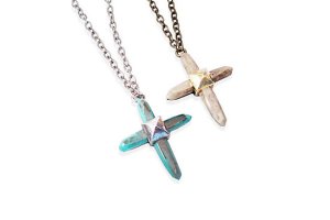Resin Crystal Cross Necklace in Turquoise Resin with Antique Silver Stud and Bone Resin with Antique Bronze Stud