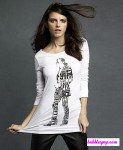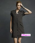 The 45 piece collection is comprised of flirty dresses–some feminine and floral, others crisper and more severe–thick tweedy separates (shorts and vests) and faux leather jackets. The simpler black and white dresses with sharp white collars stood out (they seemed the most Chanel-like) but my prediction is that the soft slouchy tees printed with Lagerfeld’s image, priced at $49, will fly off the racks.