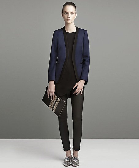 Blazer with Shiny Lapels, $90; Asymetric Top, $50; Waxed Skinny Jeans, $60; Patent Bluchers, $100