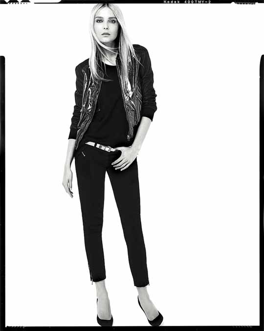 While Balmain is known for being over-the-top–both in the way of blingy embellishments and price–Pierre Balmain is refreshingly pared down and prices start at just $180 (and runs as high as $1200 for leather jackets). It’s cool, downtown street wear in the style of Emmanuelle Alt and her mini-mes: the perfect motorcycle jacket (it comes in vest form, too); low-slung skinny jeans with subtle ribbed detailing at the hips and zippers at the ankles; loose tuxedo jackets; and athletic-inspired boxy tops and jackets, someone with the “PB” Pierre Balmain logo emblazoned across the back like a varsity jacket. There was a prevalent zebra print that ran throughout the collection–it showed up on button downs and jeans–inspired by the designer’s first trip to Africa, after which he brought home a big zebra rug. The only ridiculous Balmain-ish item in the collection is the leather sweatpants. I mean, really?