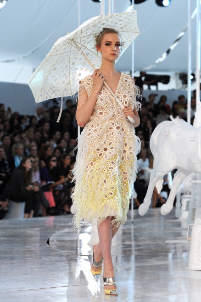 For Louis Vuitton’s spring 2012 collection, amidst rumors that this will be his last collection for the house before he takes the reins at Dior, Jacobs set his show on a fully operating CAROUSEL! The carousel was covered by a white curtain, so when the show started just before it’s scheduled start time at 10 a.m. and the curtain dropped, so did everyone’s jaws and an audible gasp ran through throughout audience. One by one models hopped off their horses and walked the round runway. Kate Moss, once again, closed the show, looking ethereal in a white sequined feathered broderie anglaise dress.