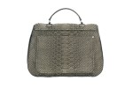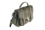 Treated python flap front satchel bag with metal foldover closure, python straps, handle and adjustable removable shoulder strap. Two-zipper pockets and one open pocket. Canvas lined interior with leather-trimmed zipper pocket.