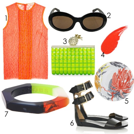 1) Christopher Kane Keke Lace Top, $745; 2) House of Harlow 1960 Audrey Sunglasses, $110; 3) Kate Spade Clutch, $225; 4) Yves Saint Laurent Rouge Volupte in Orange Shiver,$34; 5) Richard Ginori Protea Salad Plate, $75; 6) Michael Kors Vachetta Sandal, $595; 7) Marc by Marc Jacobs D2 High Tide Colorblock Bangle, $68