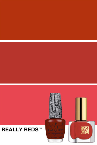 Above, from left: OPI Red Shatter, $14.95 (for Glam Slam! set with Rally Pretty Pink), visit OPI for locations; Estee Lauder Nail Lacquer in Pure Red, $19, available at Estee Lauder.