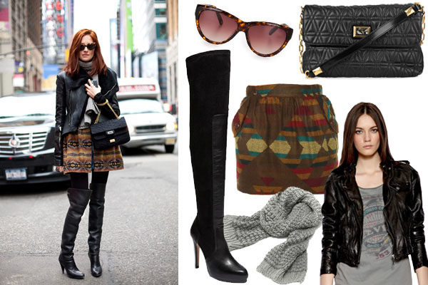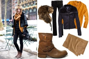 Above, from left: Topshop Faux Fur Hat, available at Topshop; AE Skinny Jean, $49.50, available atAmerican Eagle; Armani Jeans Faux Shearling Jacket, $521.36, available at Jules; J.Crew Jackie Cardigan, $39.50, available at J.Crew; J.Crew Cashmere Scarf, $69.50, available at J.Crew; Forentini and Baker Boot, $585, available at GravityPope.