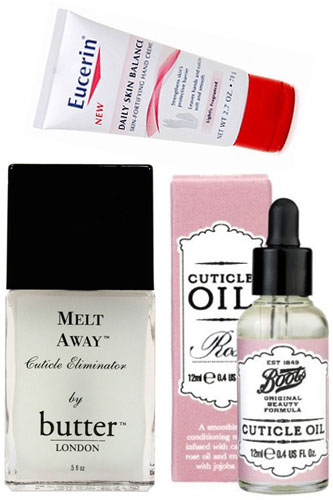 The Tools: Eucerin Daily Skin Balance Skin-Fortifying Hand Creme, $5.59, available at Drugstore.com; Boots Original Formula Cuticle Oil, $7.19, available at Target; Butter London Melt Away Cuticle Eliminator, $20, available at Butter London.