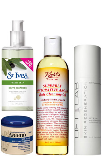 The Tools: St. Ives Fresh Skin Olive Cleanser, $5.99, available at Drugstore; Aveeno Skin Relief Moisturizing Cream, $11.79, available at Drugstore; Kiehl’s Superbly Restorative Argan Body Cleansing Oil, $28, available at Kiehl’s; LiftLab Lift & Fix High Potency Solution, $85, available at LiftLab.
