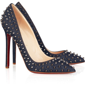 Dark-blue denim pumps with a heel that measures approximately 5 inches. These Christian Louboutin shoes have all-over gunmetal stud embellishment, a low-cut pointed toe and a signature red leather sole. Designer color: Blue Denim 500/ Gunmetal Spikes. I’M INÂ LOVE!!!